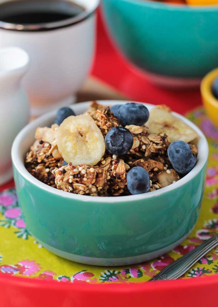 Delicious gluten free granola flavored with real coffee grounds. This Coffee Granola is the perfect pick me up for breakfast or snack!