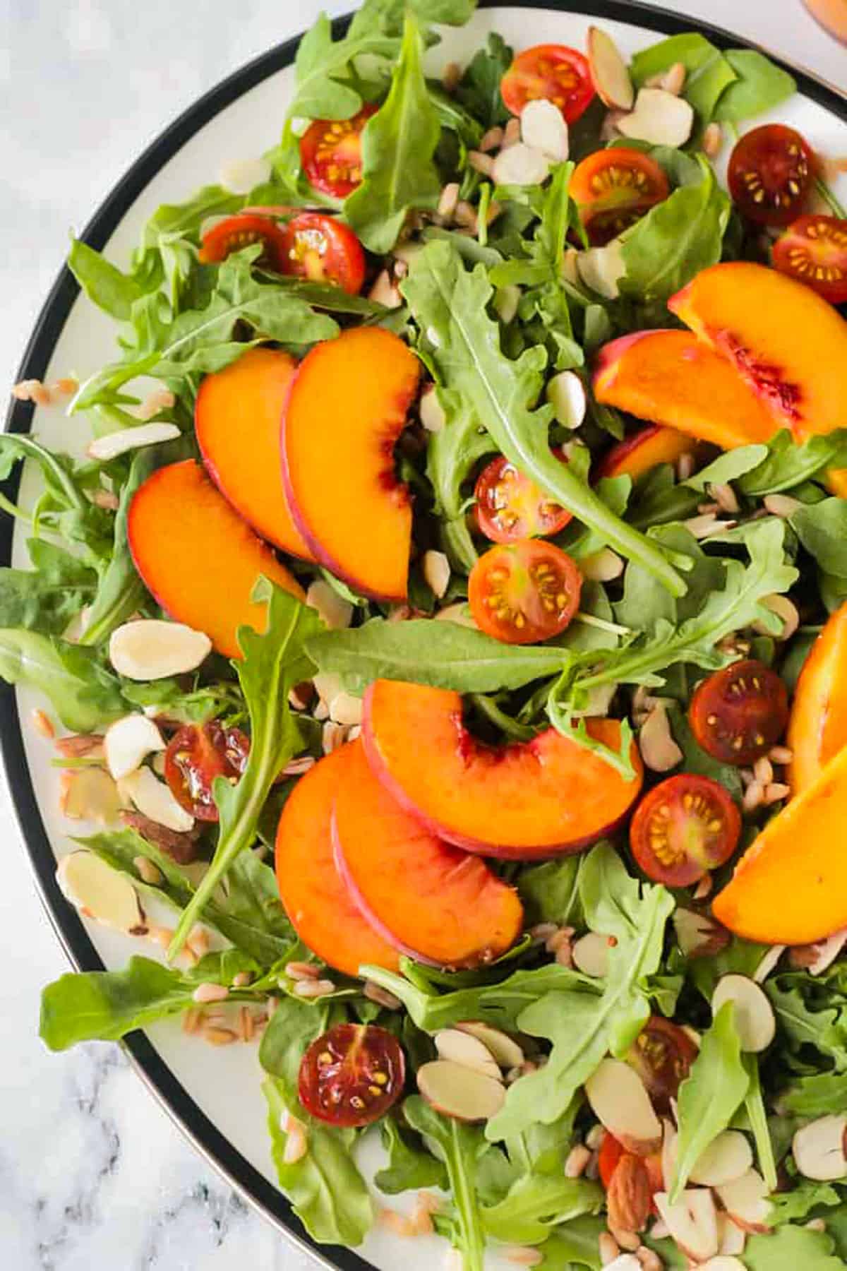 Almonds ~ I love adding nuts or seeds to salads for a crunch. You can even toast them before adding them to this arugula peach salad if you wish.