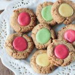 Taking about 1 tablespoon of dough at a time, press it into a ball shape (rolling it might cause it to fall apart) and place on the baking sheet. Using two fingers, gently press down on the dough to flatten it out a bit. Then with your thumb or the back of a ¼ teaspoon measuring spoon (its the perfect size), press down in the center to make a small indentation. Repeat with all the remaining dough.