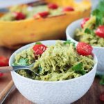 Spaghetti squash "noodles" with pesto sauce is a low carb way to satisfy your pasta cravings! No fancy gadgets required - a simple fork will magically make the spaghetti squash stands separate. Paired with the Parsley Kale Walnut Pesto, it's a flavorful, healthy, lightened up dish you can feel good about.